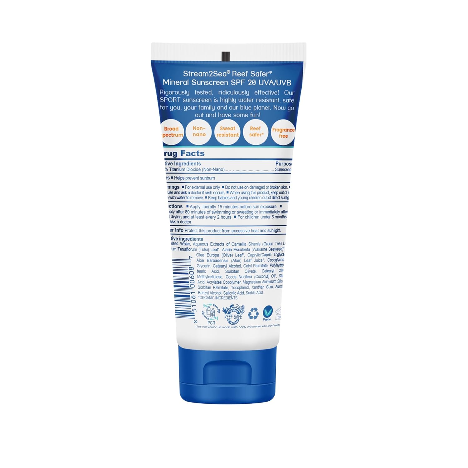 - Travel size bottles of our reef safe, biodegradable sport sunscreen with broad spectrum UVA and UVB sun protection, with a powerful antioxident blend of organic Green Tea, Tulsi, Wakame and Olive Leaf