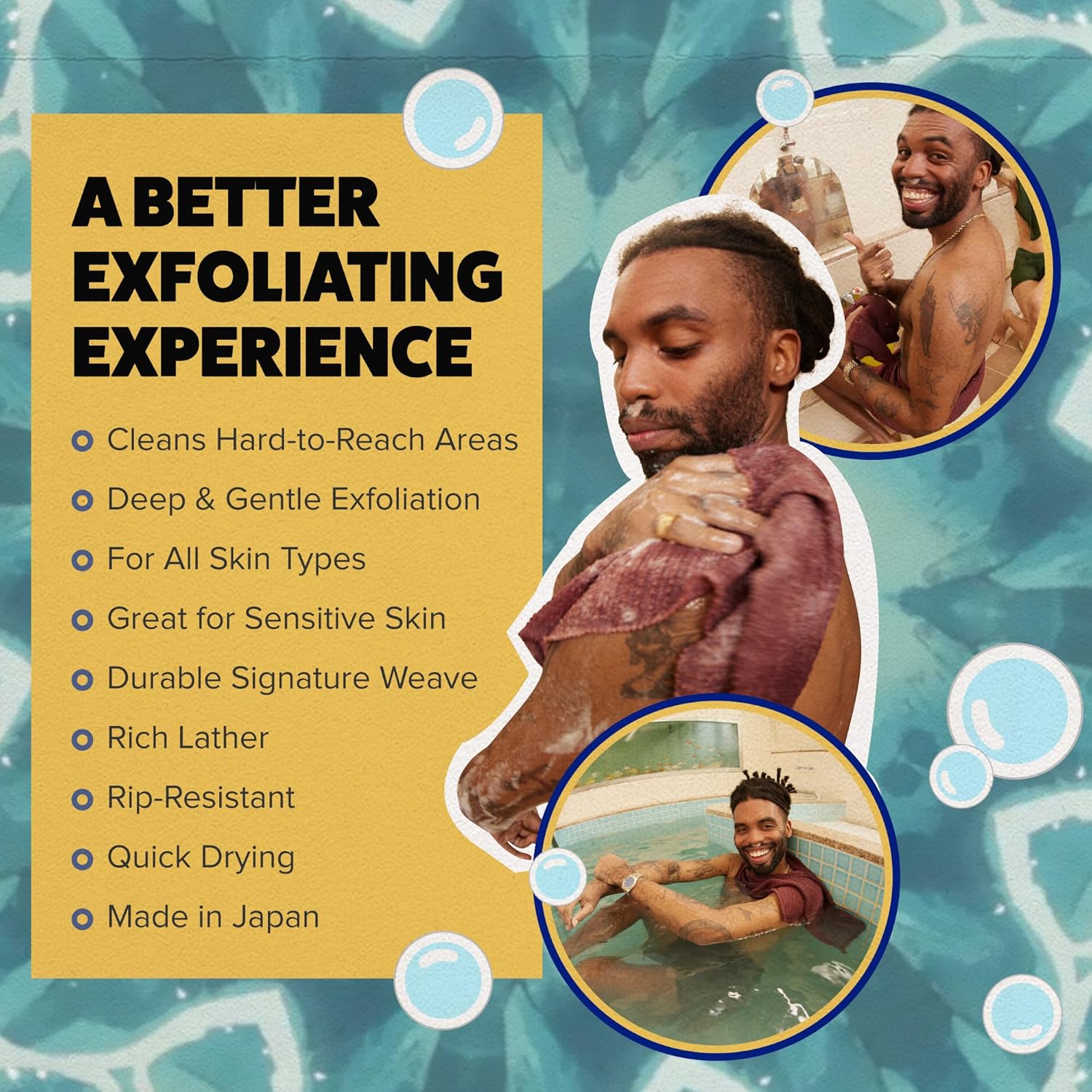 - Signature Rip-Resistant Fabric: Our towel is made up of two uniquely developed threads woven together to balance exfoliant effectiveness and efficient cleanliness. It has a thin lathering thread, tightly woven to create a rich lather for a complete clean. Plus, a textured exfoliating body scrubber thread to scrub away dirt, oil, and dead skin cells, leaving your skin smoother and softer than you ever knew possible.