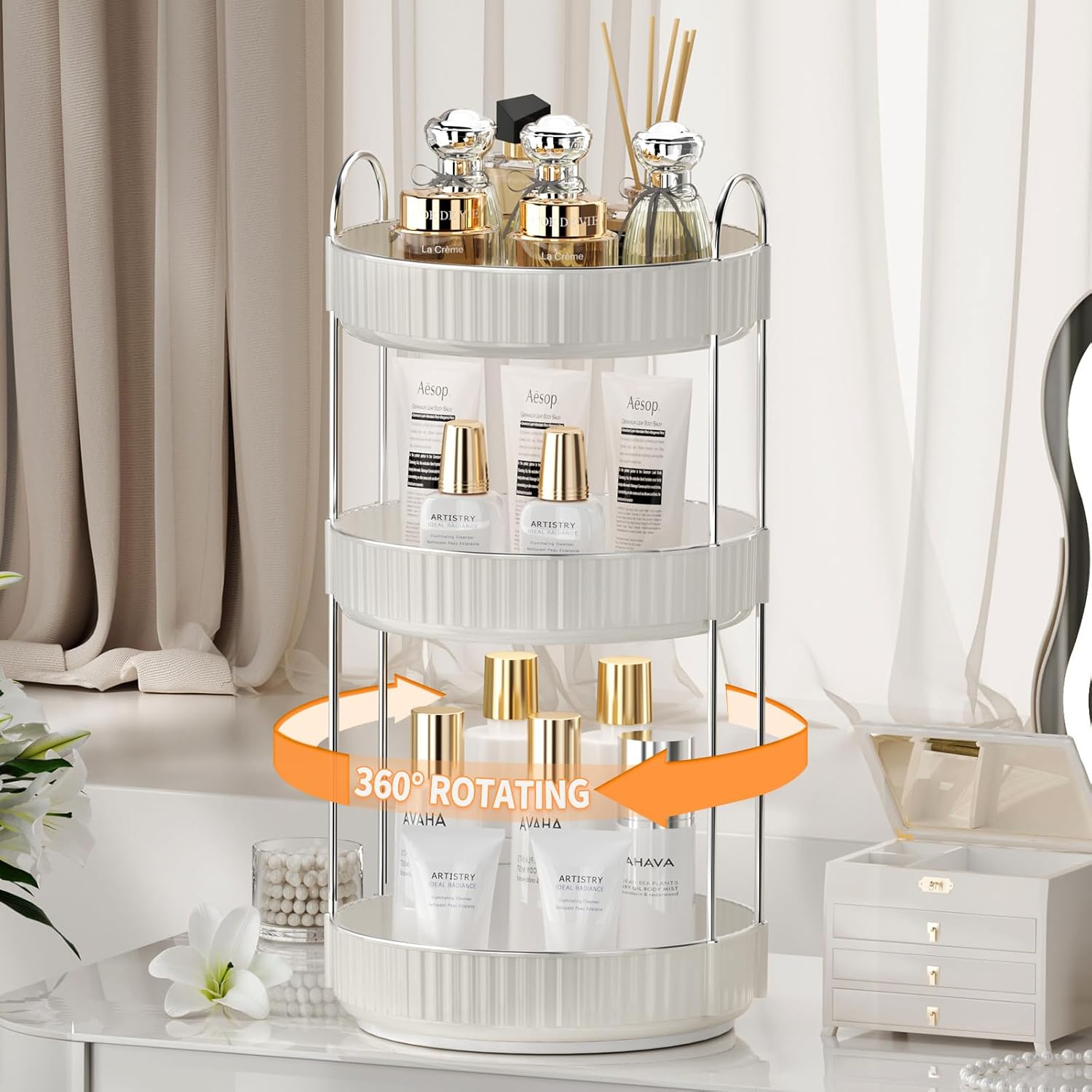 - Smooth Rotation: 360 degree rotation makes it easier to find what you need and brings you a convenient using experience. Tray edges are 1.96'' high to ensure that cosmetics do not fall out when